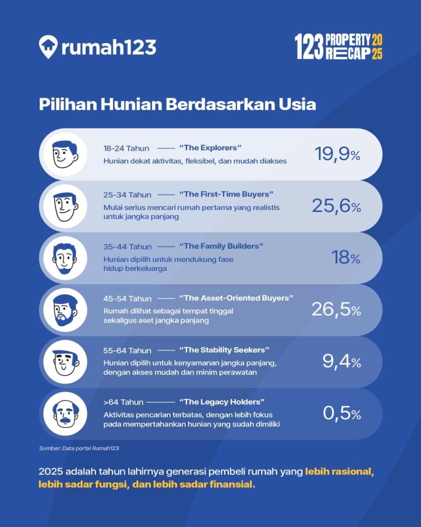 ‎Gambaran tersebut tercermin dalam laporan 123 Property Recap 2025: The Youth Move yang dirilis oleh Rumah123. Laporan ini disusun berdasarkan data agregat non-personal dari aktivitas pencarian hunian di portal Rumah123 sepanjang 2025.