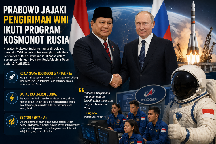 Jakarta, CoreNews.id – Presiden RI Prabowo Subianto tengah menjajaki peluang mengirim warga negara Indonesia (WNI) terbaik untuk mengikuti pelatihan kosmonot di Rusia. Rencana ini dibahas dalam pertemuan dengan Presiden Rusia Vladimir Putin pada 13 April 2026.
