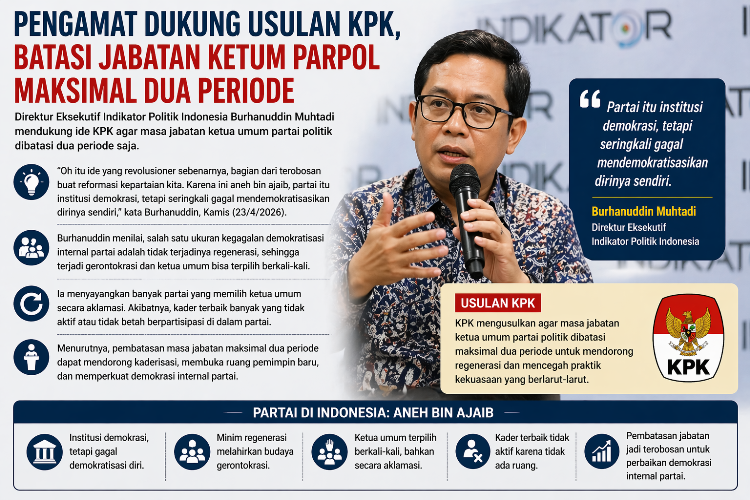 Menurut Burhanuddin, usulan tersebut merupakan langkah terobosan untuk mendorong reformasi kepartaian. Ia menilai partai politik di Indonesia kerap gagal mendemokratisasikan diri. “Partai itu institusi demokrasi, tetapi seringkali gagal mendemokratisasikan dirinya sendiri,” ujarnya di UIN Syarif Hidayatullah Jakarta, Kamis (23/4/2026).